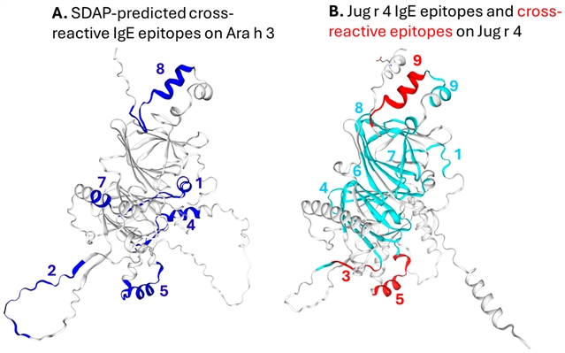 Figure 4 Ara h 3 和 Jug r 4 的分子模型预测和经验鉴定的 IgE 表位