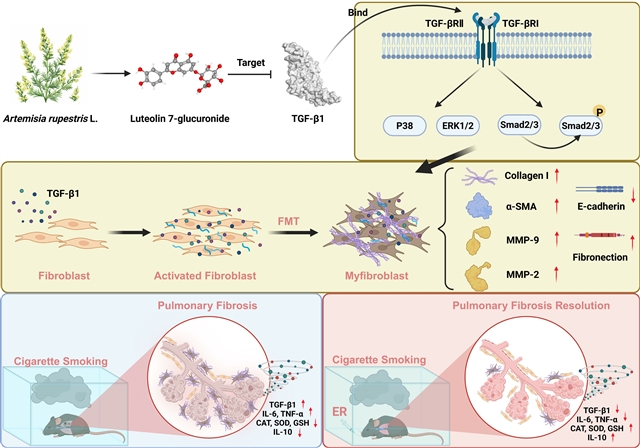 艾蒿提取物中的木犀草素-7-葡糖醛酸苷通过靶向TGF-β1抑制成纤维细胞活化和成纤维细胞向肌成纤维细胞转化(FMT),从而减轻肺纤维化。