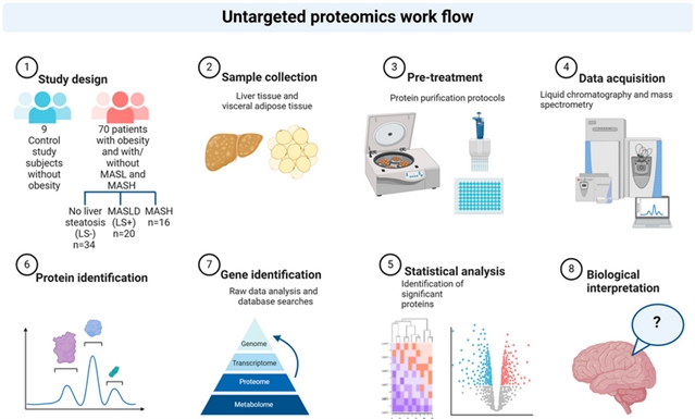 本研究采用非靶向蛋白质组学分析,对肥胖、代谢功能障碍相关脂肪性肝病(MASLD)和代谢功能障碍相关性脂肪性肝炎(MASH)患者的内脏脂肪组织(VAT)和肝脏组织配对活检。