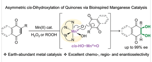 受Rieske双加氧酶催化芳基和烯基C=C键不对称顺式双羟基化反应的启发,研究组提出了一种模拟生物策略,用于实现1,4-醌的不对称顺式双羟基化反应。研究组报道了一种廉价易得的非血红素锰配合物,其配体为含有刚性手性二胺骨架和大位阻三异丙基硅基的四齿氨基吡啶结构,该催化剂可利用过氧化氢和烷基过氧化氢实现1,4-醌的顺式双羟基化反应;值得注意的是,研究组首次报道了在顺式双羟基化反应中使用烷基过氧化氢作为末端氧化剂的实例。该体系可将多种1,4-醌高效氧化为顺式-1,2-二醇,产物具有合成价值的产率、优异的化学选择性、区域选择性和对映选择性(高达99% ee),并兼具完全的非对映选择性。
