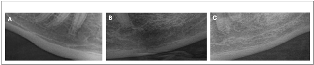 自动裁切为矩形并聚焦于颏孔区域的影像:(A)年轻患者,(B)无骨质疏松的老年患者,(C)患有骨质疏松的老年患者。