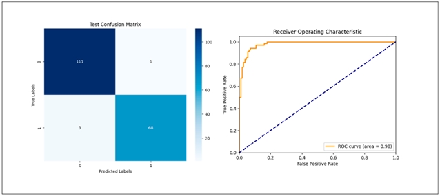 混淆矩阵显示:左图为模型在未接触过的验证集上,对骨质疏松组与年轻对照组进行检测的结果;右图为受试者工作特征(ROC)曲线。结果表明,高准确率主要源于模型识别“年轻骨骼与老年骨骼的差异”,而非真正识别骨质疏松特征,因此具有误导性。