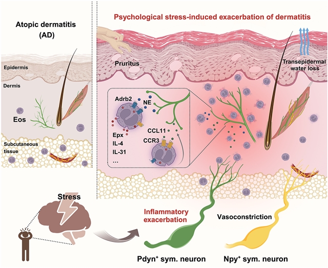 Abstract: Psychological stress is believed to exacerbate dermatitis, yet the neurobiological mechanisms linking stress to immune processes remain elusive. We identified a subset of prodynorphin-positive (Pdyn+) noradrenergic sympathetic neurons in mice that specifically innervate hairy skin, mediating stress-induced exacerbation of skin inflammation in an eosinophil-dependent manner. Genetic ablation of Pdyn+ sympathetic neurons or eosinophils mitigated stress-evoked worsening of inflammation in atopic dermatitis–like mice, whereas optogenetic activation of these neurons precipitated inflammation through eosinophils. Pdyn+ sympathetic neurons recruited eosinophils through the CCL11-CCR3 axis and activated them through the adrenergic receptor beta2 (Adrb2) in inflamed skin. Our findings reveal a neuroimmunological mechanism underlying psychological stress–induced exacerbation of dermatitis, emphasizing the Pdyn+ sympathetic-eosinophil axis as a crucial interface between the brain and skin inflammation, with potential therapeutic implications.