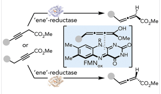 通过质子转移实现非手性炔酸酯的酶促不对称异构化来合成手性联烯酸酯,是一项极具吸引力却尚未实现的转化,其主要障碍在于天然异构酶存在显著产物抑制效应。为突破这一瓶颈,研究组将传统上属于氧化还原酶家族的黄素依赖性"烯"还原酶(EREDs)改造为氧化还原中性的立体选择性1,3-质子转移酶。
