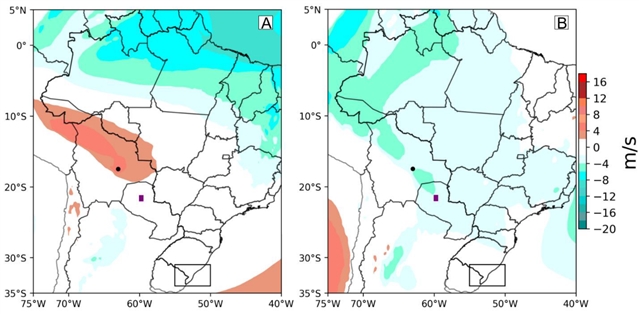 12月-2月气候平均值(1981–2020年)的风(850百帕):(A)u分量,(B)v分量。风速大小(阴影部分)单位为米/秒。矩形区域代表MSG涡所在的位置。圣克鲁斯市用黑色圆圈标记,马里斯卡尔用紫色方块标记。