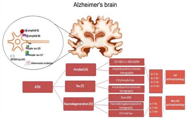 以表格与示意图结合形式,标注 A(β 淀粉样蛋白,如 Aβ42/Aβ40)、T(病理性 tau,如 p-tau217)、N(神经退行性变,如脑 MRI 萎缩)三大类生物标志物,明确 “A+T+N+” 为 AD 典型病理组合,同时区分非 AD 病理(如路易体痴呆)的标志物模式,帮助理解 AD 的生物学诊断标准。Aβ42/Aβ40 比值因其卓越的诊断工具而备受青睐。血浆 Aβ42/Aβ40 水平在症状出现前阶段会发生改变,从而能够早期发现认知正常人群的 Aβ 病理,其准确度与认知异常人群相当。P-tau217 是 p-tau 标志物中最强的,是一种强大的诊断工具,能够以更高的准确度区分 AD 与其他痴呆症。目前认为,最强的诊断性 p-tau 生物标志物是 P-tau217(与 p-tau181、p-tau231 和 p-tau205 相比)。受试者工作特征曲线下面积 (AUC) 分别为 0.943 和 0.914,p = 0.026,表明脑脊液 (CSF) p-tau217 是比 p-tau181 更有效的诊断工具。同时,脑脊液 p-tau217 水平能够可靠地区分 AD 与其他痴呆症,其准确度优于 p181。血浆 p-tau181 和 p-tau217 水平可准确预测未来(2 至 6 年内)轻度认知障碍进展为 AD 痴呆的时间。然而,p-tau217 在无症状期升高,并随着 AD 的进展而变化,从而可以早期发现和预测 AD;而较高的 p-tau217 水平则提示认知能力快速下降。鉴于外周 A-T-N-X 框架中的 T,p-tau217 凭借上述优势,是一个合适的生物标志物。
