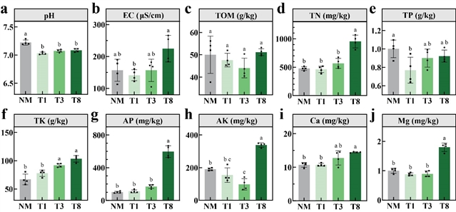 图1. 不同发育阶段的土壤理化性质。(a)pH值;(b)电导率(EC);(c)总有机物(TOM);(d)总氮(TN);(e)总磷;(f)总钾;(g)有效磷;(h)有效钾;(i)钙(Ca);(j)镁(Mg)。NM:未接种;T1、T3和T8:分别为接种后1、3和8个月的样品。