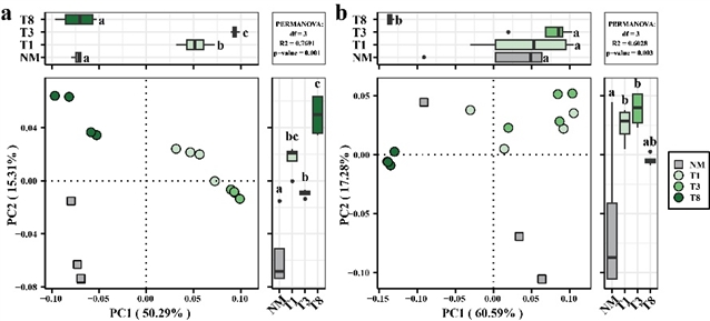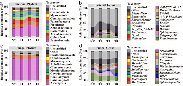 在接种和栽培过程中,土壤理化性质发生了动态变化(图1)。总体而言,接种时间对土壤性质和养分动态的影响在从初始接种到成熟菌根形成的整个过程中表现出不同的时间模式。在微生物群落结构上,未接种处理组(NM)的细菌、真菌群落结构与接种组差异明显;接种后1个月(T1)和3个月(T3)的样品,微生物群落特征高度相似,而接种8个月(T8)的样品则展现出独特的微生物群落特征(图2)。