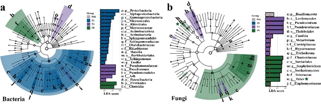 图4. 利用LEfSe分析在不同发育阶段间丰度存在显著差异的细菌(a)和真菌(b)类群。LDA=4.0。