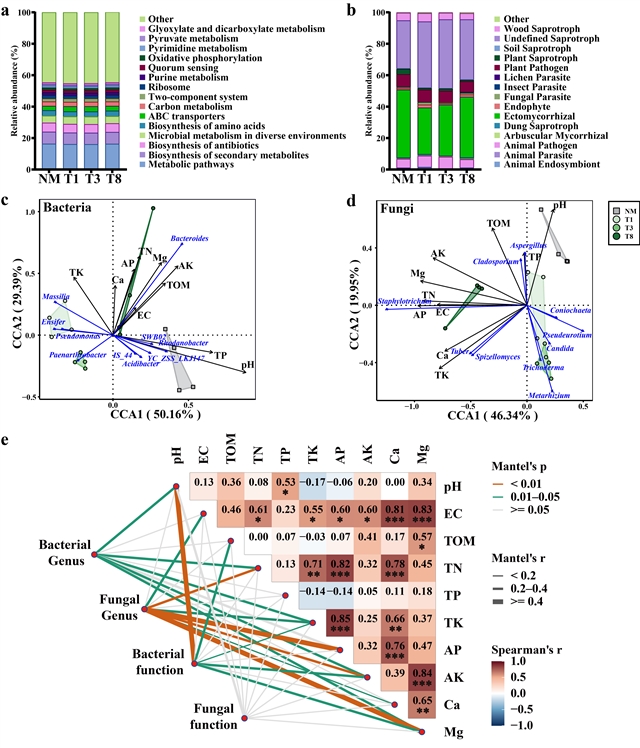 图6. 微生物功能谱及其与环境因子的关系。(a, b)不同发育阶段细菌(a)和真菌(b)群落的预测功能谱。(c, d)典型对应分析(CCA)排序图,展示土壤细菌(c)和真菌(d)群落与环境变量之间的关系。图中黑色箭头代表环境变量,蓝色箭头代表微生物类群。(e) Mantel tests显示微生物属、预测功能与环境因子之间的相关性。