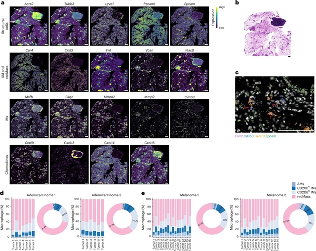 在这里,该团队揭示了组织内CD206hi和CD206lo间质巨噬细胞(IM)亚群和Ly6c2+Fn1+Vcan+募集巨噬细胞(recMacs)在肺癌中的分工。利用单细胞和空间转录组学,该课题组确定了具有相反功能的趋化因子表达的IM亚群。Cxcl13+CD206hi IMs、Cxcl9+CD206hi IMs和Cxcl10+CD206hi IMs沿支气管血管区定位,驱动三级淋巴样结构形成、淋巴细胞募集和肿瘤控制,而Ccl2+ IMs定位于肿瘤区域,募集致瘤蛋白Ly6c2+Fn1+Vcan+ recMacs。