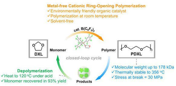 循环经济已成为全球塑料工业实现可持续发展的关键且不可逆转的未来方向,旨在缓解传统不可降解塑料所造成的严重环境污染与资源浪费问题。化学回收至单体(CRM)技术可将废弃聚合物直接转化为单体,为实现塑料循环经济提供了一条极具前景的途径。聚1,3-二氧戊环(PDXL)因其优异的化学可回收性、出色的耐热性及良好的机械性能,是一种理想的CRM用热塑性塑料,有望成为商业化石油基聚烯烃塑料的有力替代品。
