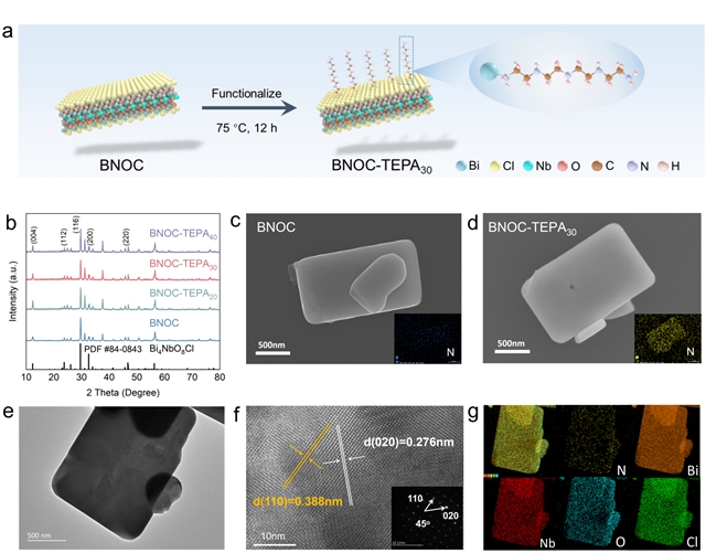 本研究通过“熔盐煅烧+接枝”的两步法,将长链分子TEPA均匀锚定在BNOC表面,构建BNOC-TEPAx系列催化剂(图1a)。XRD结果显示,氨基修饰前后所有样品均与标准BNOC相匹配,未出现杂相或峰位畸变,表明TEPA接枝并未破坏BNOC的晶体骨架(图1b)。SEM与TEM进一步证实,BNOC-TEPA30保持规则的方形纳米片形貌,尺寸约为1–3 μm,晶格间距为0.388 nm和0.276 nm,分别对应于(110)和(020)晶面(图1c–f)。另外,SEM-EDS与TEM-EDS元素映射清晰观察到N元素在纳米片表面的均匀分布(图1d、g),表明TEPA已成功、稳定地接枝到BNOC上。