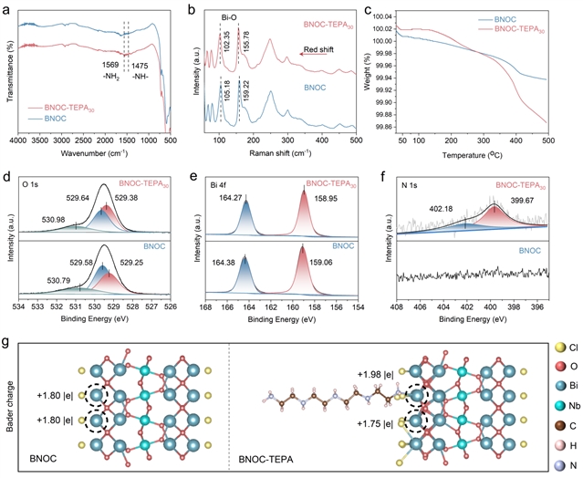 图2.(a)BNOC与BNOC-TEPA30的FTIR光谱;(b)BNOC与BNOC-TEPA30的Raman光谱;(c)BNOC与BNOC-TEPA30的TGA曲线;BNOC与BNOC-TEPA30的(d)O 1s、(e)Bi 4f 以及(f)N 1s 的高分辨XPS谱图;(g)BNOC与BNOC-TEPA的Bader电荷值。
