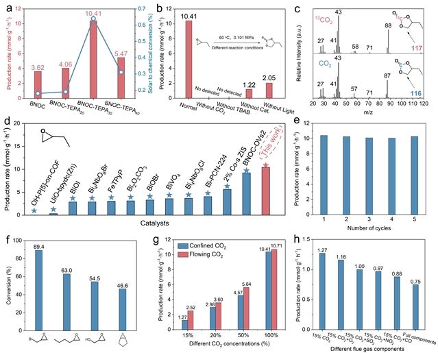 图3.(a)BNOC及BNOC-TEPAx系列催化剂的光催化CO2环加成性能;(b)BNOC-TEPA30在不同反应条件下的催化性能;(c)利用CO2(下)和13CO2(上)与1,2-环氧丁烷反应所得产物的GC–MS谱图;(d)不同催化剂在1,2-环氧丁烷光催化CO2环加成反应中的性能对比;(e)BNOC-TEPA30的循环稳定性;(f)BNOC-TEPA30对不同环氧化物的催化性能;(g)BNOC-TEPA30在不同浓度的固定量CO2及流动CO2条件下的催化性能;(h)BNOC-TEPA30在不同组分模拟烟气条件下的催化性能。模拟烟气各组分:CO2(15%,v/v)、SO2(4.4 mg·m-3)、NO2(47.1 mg·m-3)、O2(6%,v/v)、CO(11.4 mg·m-3)、N2(平衡气)。