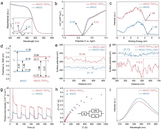 图4.(a)BNOC与BNOC-TEPA30的UV–vis漫反射光谱及对应的Tauc曲线;(b)在200 Hz条件下测得的BNOC与BNOC-TEPA30的Mott-Schottky曲线,(c)对应的价带XPS(VB-XPS)谱图;(d)能带结构示意图;(e)BNOC与(f)BNOC-TEPA30在明暗条件下的表面电势分布。(g)BNOC与BNOC-TEPA30的瞬态光电流响应,(h)电化学阻抗谱以及(i)光致发光光谱。