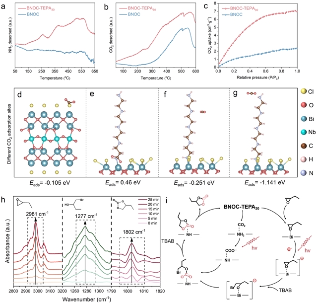 图5.(a)BNOC与BNOC-TEPA30的NH3-TPD曲线和(b)CO2-TPD曲线;(c)BNOC与BNOC-TEPA30的CO2吸附等温线;DFT计算的在(d)BNOC表面、(e)Bi–N配位位点、(f)仲胺位点以及(g)伯胺位点上的CO2吸附能;(h)BNOC-TEPA30上1,2-环氧丁烷、反应中间体及1,2-碳酸丁烯酯的原位FT-IR光谱;(i)BNOC-TEPA30上CO2与1,2-环氧丁烷光催化环加成反应的机理示意图。