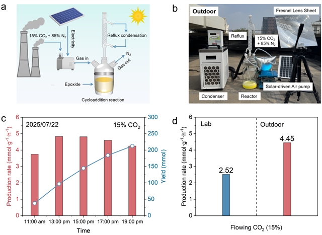 3. 放大体系及户外阳光实验验证了在模拟烟气条件下太阳能驱动CO2环加成反应的高效可行性。