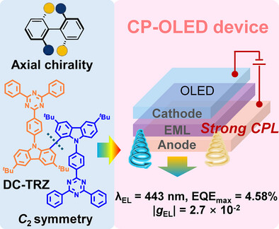 Abstract: Deep blue circularly polarized organic light-emitting diodes (CP-OLEDs) remain scarce due to the stringent requirement of simultaneously achieving a wide bandgap and strong chiroptical activity. Herein, we report DC-TRZ, a C2-symmetric chiral emitter comprising a dimeric carbazole donor and a triphenyltriazine acceptor, which exhibits deep-blue emission at 433 nm with the high emission efficiency of up to 79%. Its enantiopure (R)- and (S)-isomers display pronounced Cotton effects and distinct circularly polarized luminescence (CPL). Notably, CP-OLEDs based on (R)- and (S)-DC-TRZ deliver deep-blue electroluminescence with Commission Internationale de L'Eclairage (CIE) coordinates of (0.14, 0.07), achieving a maximum external quantum efficiency of 4.58% and record-high luminescence dissymmetry factors of +2.7 × 102 and 2.2 × 102, respectively, representing the highest values reported to date for blue CP-OLEDs employing small organic molecules. These results demonstrate that DC-TRZ functions as an efficient deep-blue chiral emitter and highlights C2-symmetric axial chirality as a promising molecular design strategy for high-performance CP-OLED materials.