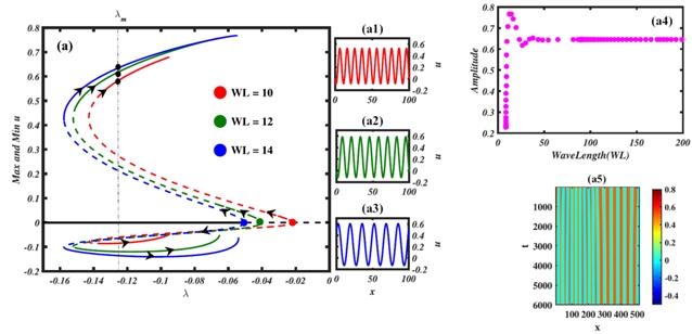 图 1不同波长周期斑图的共存结构。分岔图展示了图灵不稳定区内多种周期斑图状态的共存现象。(a1)-(a3) 不同波长的空间结构;(a4) 振幅随波长变化关系;(a5) 两种不同波长斑图共存的类嵌合结构。