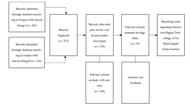 本研究采用系统性文献综述方法,遵循规范化的五步流程:定义研究问题、确定筛选标准、检索文献、筛选与综合、报告结果。文献检索在Scopus数据库进行,使用两组涵盖“清真供应链/物流”与“优化/区块链/人工智能/技术”等关键词的组合进行搜索。时间跨度为2008年至2023年。最终,从初始的394篇文献中,通过去重、类型筛选及全文内容审查,确定了70篇符合标准的学术文章作为分析样本。