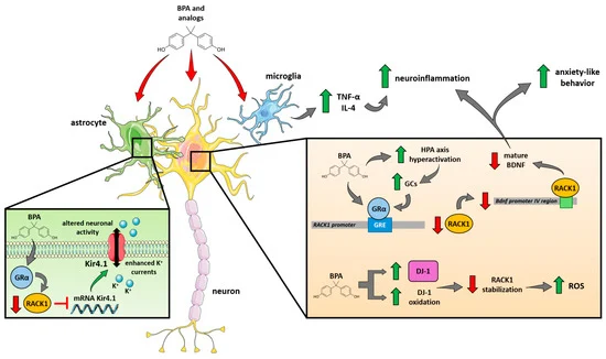 图3. 以RACK1为中心枢纽的毒理学模型提议,用以解释双酚介导的对INEN的不良影响。在神经元水平上,BPA可以直接(通过GRα激动作用)和间接(通过HPA轴过度激活导致的糖皮质激素分泌增加)引起RACK1下调,导致成熟BDNF产生减少,这与焦虑样行为和神经炎症增加相关;同时,BPA诱导的DJ-1表达增加和氧化作用有助于减少RACK1的稳定性,导致ROS清除能力下降和氧化应激增加。在小胶质细胞中,BPA刺激TNF-α和IL-4的产生和释放,从而促进并加剧神经炎症。最后,在星形胶质细胞中,BPA可能激活GRα并降低RACK1表达;RACK1水平下降,本来RACK1有助于下调Kir4.1 mRNA,RACK1下降导致Kir4.1表达增加,从而增强K?电流并改变神经元活动。