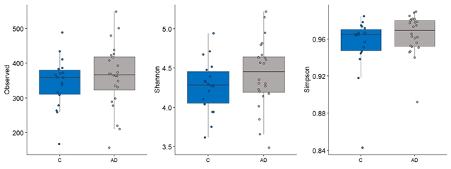 α多样性分析显示,AD组与对照组在菌群多样性方面无显著差异,表明疾病状态主要影响特定菌群的丰度,而非整体多样性。