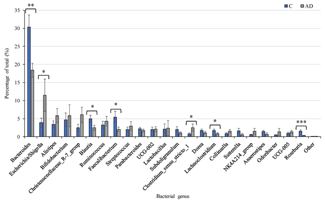 核心发现:多个细菌分类群的丰度在不同组间存在显著差异。AD组中大肠杆菌 / 志贺氏菌属( p = 0.04)和严格梭菌属 1( p = 0.03)的丰度均显著高于对照组。相反,对照组中拟杆菌属、布劳特氏菌属、罗斯氏菌属和粪杆菌属的丰度 ( p 值分别为 0.002、0.02、0.0001 和 0.02 )显著高于 AD组。 Collinsella 属的平均丰度虽有波动,但 AD组(1.5%)高于对照组(0.9%)。