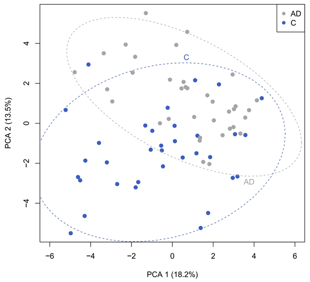 为了确定不同数据集间是否存在关联,研究者进行了相关性分析,涵盖全部人群以及对照组和AD组参与者之间的差异。针对细菌和脂肪酸代谢物的主成分分析显示,对照组和AD组个体之间存在明显的分离。