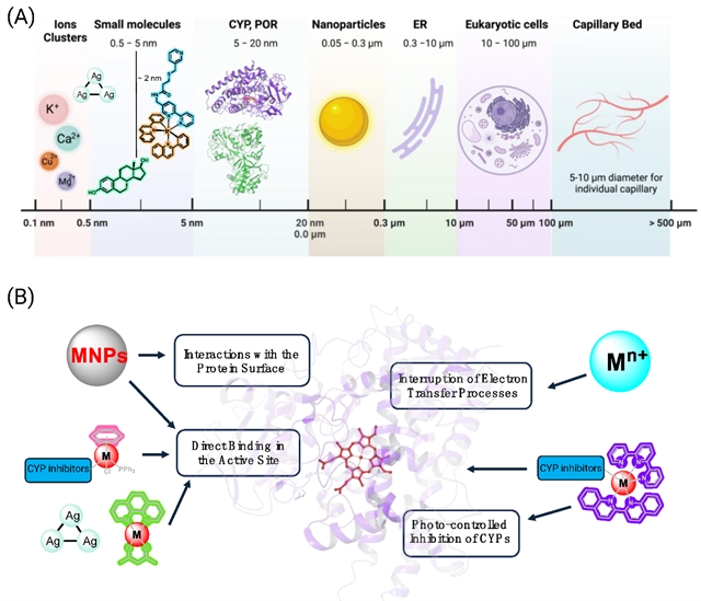 虽然CYP被认为主要作用于疏水性有机底物,但无机离子、簇、粒子和络合物(有机金属和配位络合物)也会对CYP活性产生重大影响。当掺入CYP抑制剂的含金属成分是疏水的或总电荷较低时,CYP结合行为可以保持或增强。然而,一个缺点是在复杂的生物环境中可能与其他系统发生非预期的相互作用,这揭示了在针对含金属化合物靶向CYP时应考虑的额外因素。参与药物代谢的CYP可以结合多种底物,且部分酶具有多个结合位点,因此应考虑在另一种分子已经处于活性位点时,该分子仍可能与酶结合并潜在抑制其活性的可能性。