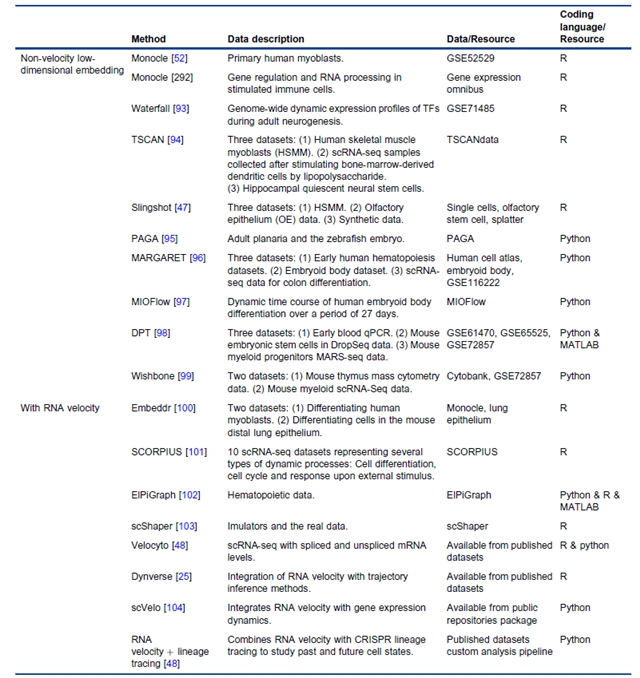 计算方法的核心是 “从海量数据中重构谱系关系”,按是否利用 RNA velocity 分为两类(表2):非 RNA velocity 方法基于单细胞转录组静态快照,通过图基方法(如 Monocle、Slingshot)、流形学习方法(如 DPT、Wishbone)、主曲线方法(如 SCORPIUS、ElPiGraph)等重构轨迹,还包括基于 SNP/CNV 的肿瘤谱系追踪工具(如 EXPANDS、MEDALT);含 RNA velocity 方法则结合未剪接 / 已剪接 mRNA 的动力学特征,预测细胞未来状态,代表工具包括 Velocyto、scVelo、PhyloVelo 等,可同时追溯细胞 “过去谱系” 与 “未来分化路径”,显著提升时间分辨率。
