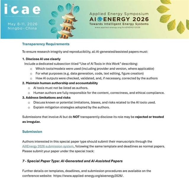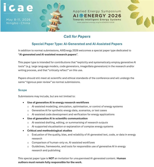 Applied Energy Symposium: AIXEnergy 2026现已开放论文投稿系统。除了常规传统论文投稿方式, AIXEnergy 2026增加了特别投稿:AI-Generated and AI-Assisted Research Papers(AI生成与AI辅助研究论文)。该类型论文鼓励作者在研究过程中系统使用生成式AI工具(如大语言模型、代码生成器、图像/数据生成工具等),并对其在科研流程中的作用进行明确说明与批判性反思。
