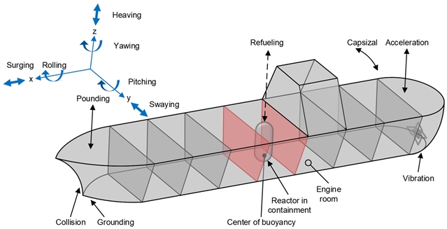 研究深入分析了海洋反应堆设计的独特挑战。与陆基核电站不同,船用反应堆必须布置在船体中央(如下图所示)以维持船舶稳定性,同时需承受海浪引起的横摇与纵倾运动。这种三维运动环境对依赖自然循环的被动安全系统提出了严峻考验。研究指出,核动力船舶必须建立四道放射性防护屏障:燃料包壳、一回路压力边界、安全壳结构以及作为最终屏障的船体本身。此外,反应堆舱室周围还布置了复杂的碰撞保护结构和多层辐射屏蔽层,以确保在碰撞、搁浅甚至沉没等极端海难工况下的安全性。