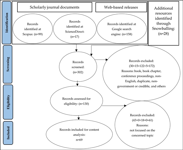 本研究遵循PRISMA流程进行系统检索与筛选 (图2),通过数据库 (Scopus、ScienceDirect) 与网络发布 (含地图、政策与报告) 的双通道检索,并辅以“滚雪球”法补充证据;随后采用演绎式内容分析构建并验证编码体系:在“气候风险因子-聚居区脆弱性-影响等级”三类单元下,提炼共性概念并统计频次,形成跨地区、跨来源的综合证据库 (图3)。为增强可靠性,研究引入第二编码者进行一致性校核。