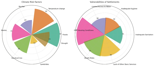 结果显示,影响最广的七类气候风险为:洪水、温度变化、风暴、海平面上升、干旱、降雨极端与滑坡;其中洪水 (44篇) 与温度变化 (41篇) 被讨论最为频繁;对应的核心脆弱性包括糟糕的住房条件 (64篇)、健康风险 (50篇)、其他基础服务匮乏 (49篇)、卫生与清洁设施不足、缺水等。研究指出,非正规聚居区常位于高风险带且基础设施薄弱,易形成直接损害 (如生命财产损失)、间接影响 (资源获取受阻) 与低强度但长期累积的影响 (如服务中断),需要“社区-住户”两级的适应行动同步推进。