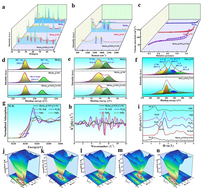 图2. 结构与化学分析。所制备的三种MoSe2基样品的(a) XRD图谱,(b) 拉曼光谱,和(c) N2吸附/脱附等温线。三种MoSe2基样品的(d) 高分辨率Mo 3d,(e) Se 3d,和(f) C 1s XPS光谱。MoSe2@NiN4Cl-NC与四种参考样品的(g) Ni K-edge XANES光谱,(h) 拟合的EXAFS光谱,和(i) FT-EXAFS光谱。(j) MoSe2@NiN4Cl-NC,(k) Ni箔,(l) Ni2O3,(m) NiO,和(n) NiPc在Ni K-edge处的小波变换等高线图。