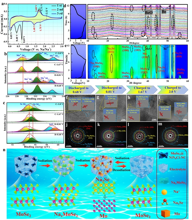 图3. 通过多技术表征揭示机理。(a) MoSe2@NiN4Cl-NC在0.5 mV s-1下记录的CV曲线。在指定电压阶段的非原位XPS分析:(b) Mo 3d核心能级,(c) Se 3d核心能级。(d, e) MoSe2@NiN4Cl-NC原位XRD图。通过非原位HRTEM/SAED记录的微观结构演化:(f, j) 0.68 V(放电态),(g, k) 0.01 V(深度放电态),(h, l) 1.67 V(充电态),(i, m) 3.0 V(完全充电态)。(n) 总结MoSe2@NiN4Cl-NC中Na+离子存储机理的概念图。