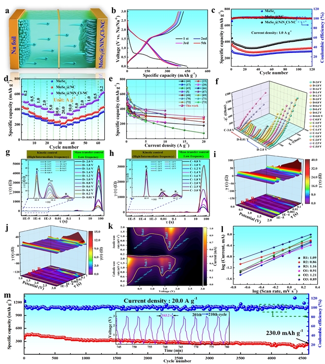 图4. 全面的电化学评估。(a) 采用液体电解质的半电池装置示意图。(b) MoSe2@NiN4Cl-NC在1.0 A g-1下的充放电电压曲线。(c) 所制备的三种MoSe2基样品在1.0 A g-1下的循环耐久性和(d) 在不同倍率下的倍率性能评估。(e) MoSe2@NiN4Cl-NC与文献报道的先进MoSe2基负极的倍率依赖性可逆容量比较研究。(f) MoSe2@NiN4Cl-NC在初始循环期间通过原位EIS获得的动态奈奎斯特图。根据测得的阻抗数据计算的DRT图,用于MoSe2@NiN4Cl-NC在首次(g) 放电和(h) 充电过程中的分析。(i) MoSe2@NiN4Cl-NC在首次放电和(j) 充电过程中的三维DRT等高线图。(k) MoSe2@NiN4Cl-NC的扫速依赖性CV等高线图,可视化电流响应演化。(l) MoSe2@NiN4Cl-NC在六个不同氧化还原峰处的峰值电流(log(i))与扫描速率(log(v))的对数分析。(m) MoSe2@NiN4Cl-NC在20.0 A g-1下的高倍率耐久性测试,插图为第201至210次循环的代表性GCD曲线。