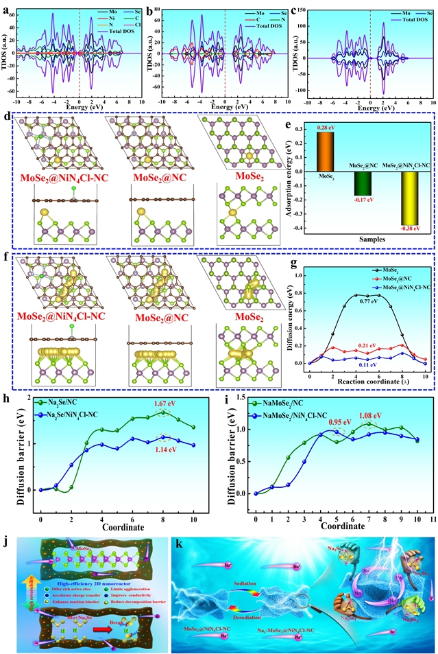 图6. 电化学性能的计算见解。(a) MoSe2@NiN4Cl-NC,(b) MoSe2@NC,和(c) MoSe2模型的计算态密度谱。(d) 每个吸附了一个Na+离子的系统的优化结构构型和(e) 计算的Na+吸附能。(f) 模拟的Na+扩散路径和(g) 所有三个系统的相应量化能垒。(h) Na3Se和(i) NaMoSe2在NC和NiN4Cl-NC基底上的计算分解能垒。(j) 二维NiN4Cl-NC纳米反应器促进MoSe2中可逆转化动力学的示意图。(k) MoSe2@NiN4Cl-NC结构通过催化限域抑制多硒化物迁移的图示。