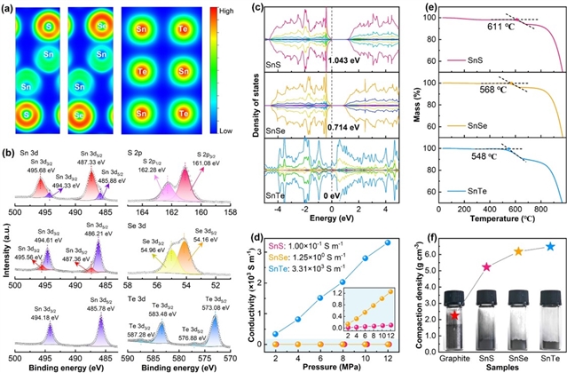 电子局域函数显示SnS/SnSe中Sn-S/Sn-Se键存在明显电子云极化,而SnTe中Sn-Te相互作用较弱。XPS分析表明SnS中高价态Sn占比91%,SnTe中全部为低价态Sn,且Te呈非完全氧化态,证实Sn-Te键合作用减弱。态密度计算显示SnS/SnSe存在带隙(0.654 eV和0.327 eV),为半导体特性;SnTe在费米能级处无带隙,呈金属导电性。实验测得SnTe电导率高达3.31×103 S/m,较SnS(10−1 S/m)和SnSe(100 S/m)提升3–4个数量级。此外,SnTe振实密度达6.48 g/cm3,远高于石墨(2.25 g/cm3),有利于提升体积能量密度。