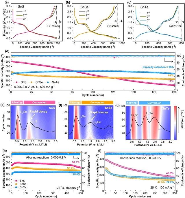 电化学测试表明,SnTe电极在200次循环后仍保持698 mAh/g的可逆容量,容量保持率高达95%,远优于SnS(17%)和SnSe(61%)。dQ/dV峰强演变分析显示,SnS/SnSe在~1.5 V处的转化反应峰(Li2S/Li2Se)快速衰减甚至消失,而SnTe的Li2Te转化峰保持良好,表明Te基转化产物具有更高的可逆性和反应动力学。不同电压窗口的循环测试证实,三者的合金化区循环均较稳定(500次循环后保持率>90%),而转化区循环稳定性差异显著,SnTe转化区容量保持率(62%)明显高于SnS(45.8%)和SnSe(47.5%)。