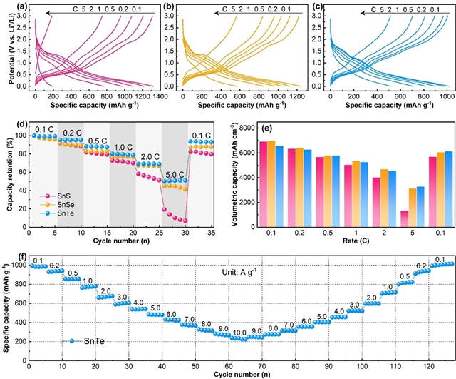图5. SnX电极的倍率性能、体积容量及SnTe高倍率循环