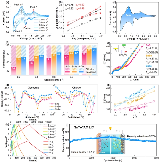 图6. SnTe电极的赝电容贡献、锂扩散系数、EIS及AC//SnTe电容器性能