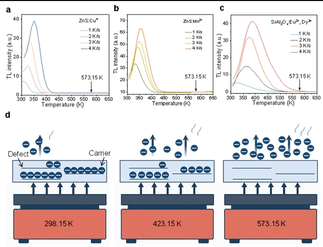图4. ZnS: Cu+@PDMS、ZnS: Mn2+@PDMS和SrAl2O4: Eu2+, Dy3+@PDMS的TL特性。a–c,ZnS:Cu+、ZnS:Mn2+和SrAl2O4:Eu2+, Dy3+在不同升温速率(1–5 K/s)下的TL曲线。d,不同温度下载流子从浅陷阱和深陷阱释放的示意图。