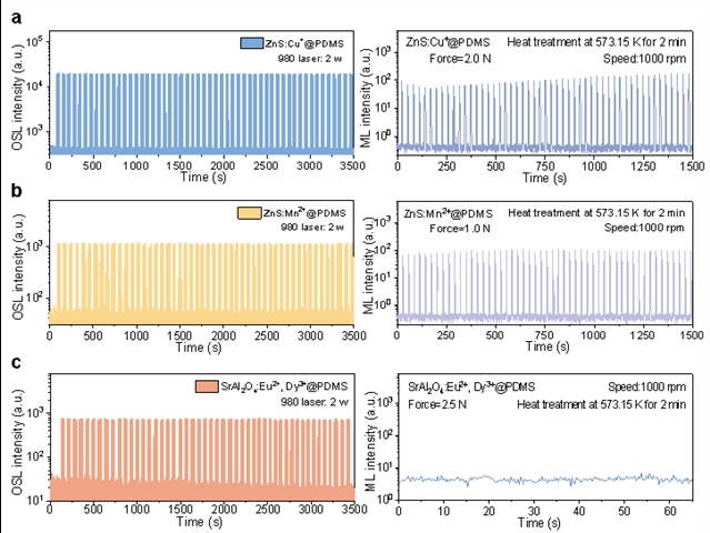 图5. 高温热处理后ZnS: Cu+@PDMS、ZnS: Mn2+@PDMS和SrAl2O4: Eu2+, Dy3+@PDMS的OSL和ML强度比较。(左图):980 nm激光激发下,a、ZnS: Cu+、b、ZnS: Mn2+和c、SrAl2O4: Eu2+, Dy3+的OSL衰减曲线。(右图):1000 rpm重复循环机械刺激下,a、ZnS: Cu+、b、ZnS: Mn2+和c、SrAl2O4: Eu2+, Dy3+的ML强度衰减曲线。注:所有样品在测试前均于573.15 K下热处理5 min。