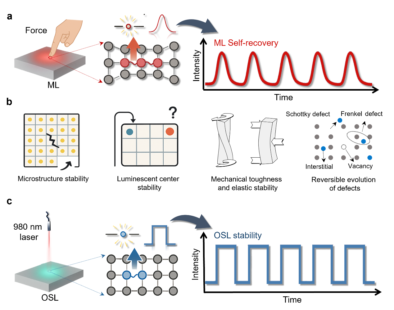 本文首先用示意图搭建了全文的研究逻辑:一方面,机械刺激会触发材料产生ML,而且理想状态下这种ML在多次循环作用后仍应保持稳定,也就是具备“自恢复”能力;另一方面,980 nm激光激发下的光激励发光(optically-stimulated luminescence,OSL)同样依赖陷阱中载流子的释放与复合。本问进一步指出,微观结构稳定性、发光中心稳定性、材料的力学韧性以及缺陷的可逆演化,可能共同决定ML在循环过程中的表现。正因为ML和OSL在底层上都与载流子的俘获、释放和复合有关,本文提出了一个关键问题:OSL的稳定性,能否作为ML自恢复能力的预测指标?