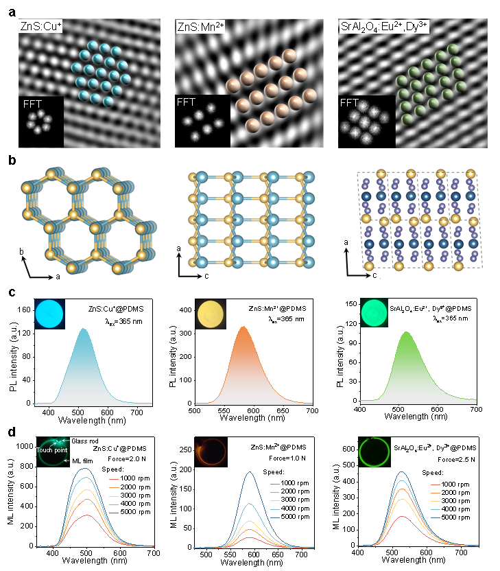 图1系统展示了三种代表性材料ZnS:Cu+、ZnS:Mn2+和SrAl2O4:Eu2+,Dy3+的微观结构与发光特征。高分辨TEM、FFT和反FFT结果表明,这三种材料都具有较高结晶质量,没有明显杂相,为后续比较其发光行为提供了可靠前提。晶体结构示意进一步说明,ZnS:Cu+为六方纤锌矿结构,ZnS:Mn2+为立方闪锌矿结构,而SrAl2O4:Eu2+,Dy3+则是更复杂的单斜结构。PL光谱和ML光谱显示,三者在365 nm激发下分别呈现典型的蓝光、橙光和绿光发射;同时,随着转速提高,它们的ML强度整体增强,但不同材料在发光峰位、峰形和响应强度上表现出明显差异,这也暗示了它们对应的发光机制并不相同。