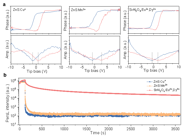 图2. ZnS:Cu+、ZnS:Mn2+和SrAl2O4:Eu2+,Dy3+的PFM和PersL衰减测量结果。a,在不同探针偏置电压下,ZnS:Cu+(左)、ZnS:Mn2+(中)和SrAl2O4:Eu2+,Dy3+(右)的相位(上)和振幅(下)响应的PFM测量结果。蓝色和红色曲线分别代表正偏置电压和负偏置电压。ZnS:Cu+和ZnS:Mn2+的相位响应均出现明显的转变,其中ZnS:Mn2+的变化更为显著。b,三种材料的PersL衰减曲线。与ZnS:Cu+(蓝色)和ZnS:Mn2+(橙色)相比,SrAl2O4:Eu2+,Dy3+(红色)的PersL强度显著更高,且衰减更慢。