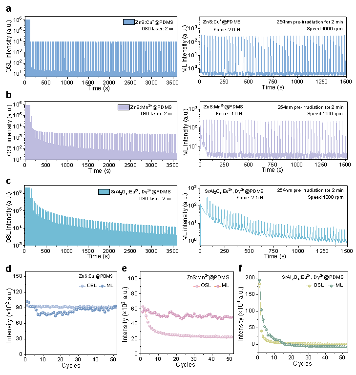 图3. ZnS:Cu+、ZnS:Mn2+和SrAl2O4:Eu2+, Dy3+的OSL稳定性及ML自恢复性能比较。左图:a、ZnS:Cu+、b、ZnS:Mn2+和c、SrAl2O4:Eu2+, Dy3+在980 nm激光激发下的OSL衰减曲线(激发时间30 s,间隔30 s)。右图:a、ZnS:Cu+、b、ZnS:Mn2+和c、SrAl2O4:Eu2+, Dy3+在1000 rpm重复循环机械刺激下的ML强度衰减曲线(紫外预照射波长:254 nm,时间:2 min)。d–f:各材料在50次循环中的OSL和ML强度归一化衰减趋势。