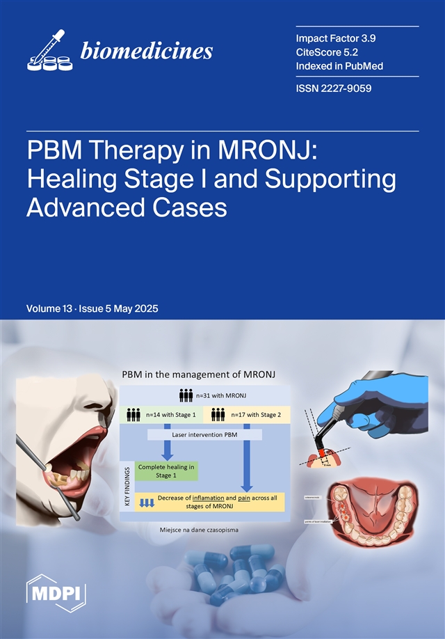 Michalak, F.; Dominiak, M.; Grzech-Lesniak, Z.; Kiryk, J.; Grzech-Lesniak, K. Photobiomodulation in Medication-Related Osteonecrosis of the Jaw: Outcomes in Stage I and Its Adjunctive Role in Advanced Cases. Biomedicines 2025, 13, 1042. https://doi.org/10.3390/biomedicines13051042